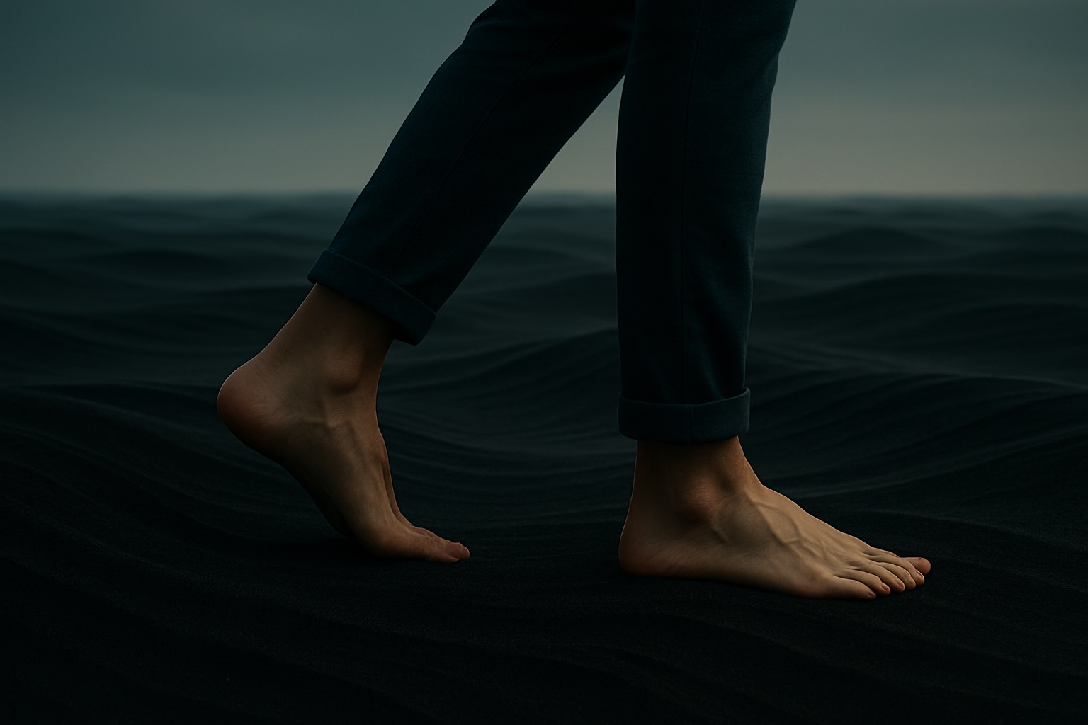 Frame from the “Roaring Fire” video showing the lone subject walking across a vast black-sand desert, capturing the video’s dreamlike mood, isolation, and cinematic, AI-generated atmosphere.